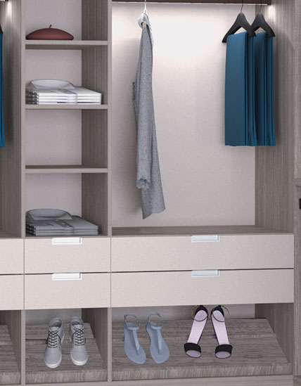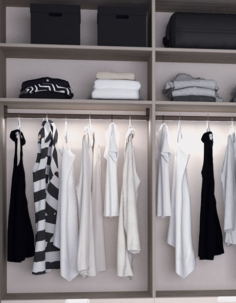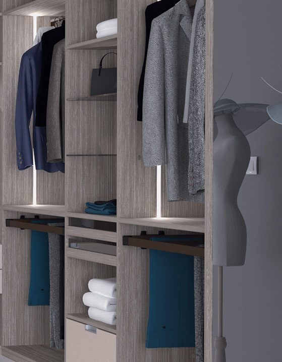 Accessoires : penderies relevables, tiroirs à chemises avec bandeau verre, porte-pantalons sur cadre coulissant, barres de penderie LED, profils LED encastrés dans les côtés et le plafond.